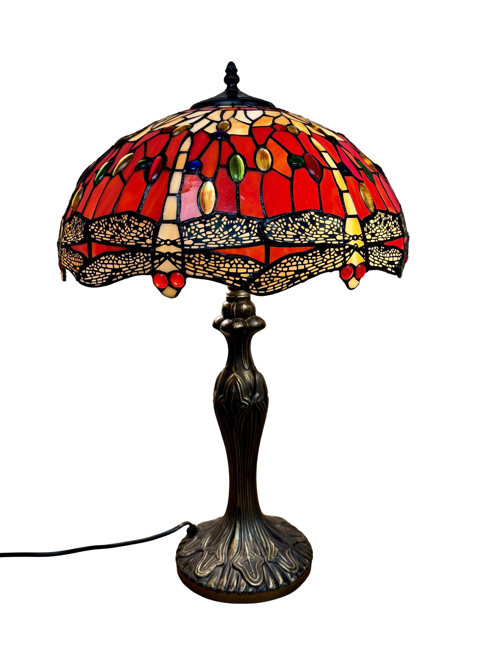 This is a large Tiffany-style lamp, approximately created in the 1980s. The lamp features a stained-glass shade with intricate designs, typical of the Tiffany aesthetic. The base is made of metal, providing stability and support. The overall design reflects the decorative arts style of the early 20th century.